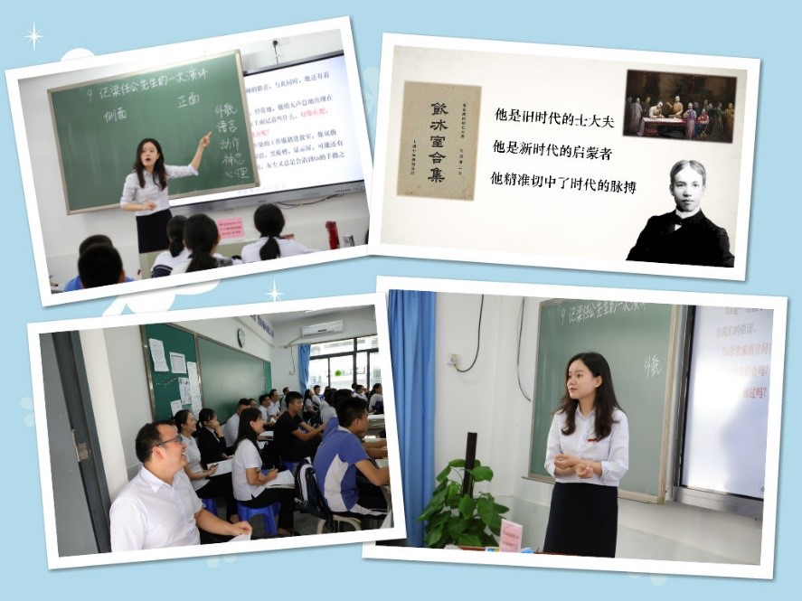 就这样,杨老师引导同学们把从习作中总结出的写作方法,用在分析课文里梁启超先生的人物形象中,从而在脑海中构建出一个文本的梁任公。接着,杨老师又以她声情并茂的演绎,讲解梁启超先生的历史地位和爱国人格。杨老师明暗双线交织的教学过程,为同学们真实生动地还原了“十年饮冰,难凉热血”的巨匠丰姿。