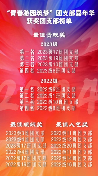 本次团支部嘉年华评选结果揭晓,共评选出每个年级义卖金额最多的最佳贡献奖4名,以及最佳组织奖和最佳人气奖各3名,具体榜单如下。
