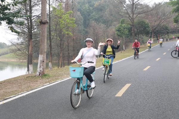 环湖20公里的绿道,长跑健将们选择用脚步丈量松山湖的自然美丽。爱好骑行的老师们租辆自行车停停拍拍,欣赏湖光山色,谈笑聊天,惬意非常。