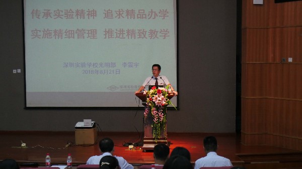 光明部李震宇部主任做《传承实验精神,追求精品办学,实施精细管理,推进精致教学》的主题报告,为此次培训拉开序幕。在报告中,李震宇主任强调学校制度文化建设和教师行为文化的重要性,希望全体教师不忘初心,传承实验文化,携砥砺之精神前行;不忘尊重,树立实验规则,怀敬畏之态度前行;不忘内涵,创新实验课程,秉育人之情怀前行。高中部程学军部主任应邀出席并做《涵泳优游,声光远播》的主题讲话。程主任以一名老实验人的亲身经历和体会深刻阐述了规则意识、责任意识、奉献精神对教师发展的重要意义,并深情寄语光明部的老师们:每一个实验人都要有努力成为中华民族脊梁的追求。这种追求所体现的崇高性,正是实验文化的鲜明特征之所在。实验学校年度教师、高中部优秀班主任徐怡华老师用自己三十年的实验情怀和对班主任工作的深刻认识,以及高超的班主任工作艺术,生动讲述了实验人应有的品格和情怀。