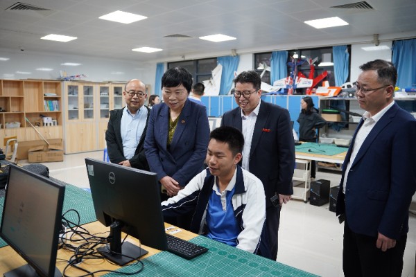 社团活动时段,一行人来到通用技术教室。正在进行三维建模的高二学生介绍,创客社团的同学每周一至周四下午,都有“课后一小时”开展社团活动。当杨昌利同志了解到,同学们可以充分利用3D打印机、激光切割机、开源硬件等各种创客设备搭建智能装置来解决真实问题时,她鼓励同学将来报考相关专业,为国家战略发展贡献力量。