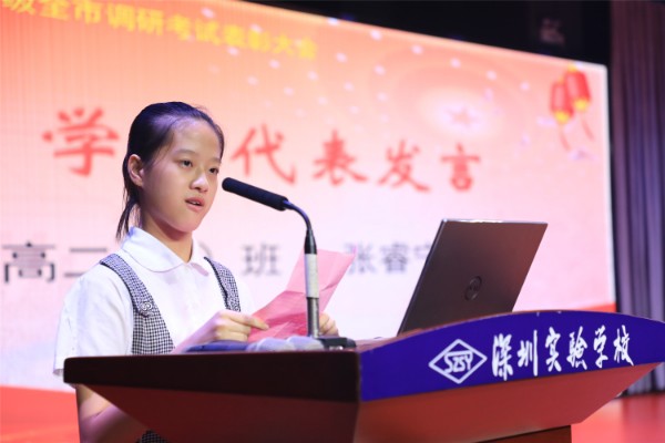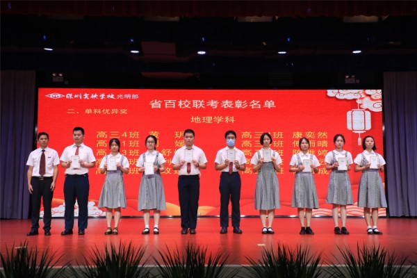 2020年9月24日下午,光明部报告厅灯光闪烁,屏幕火红,在如雷贯耳的掌声中,主持人周向东老师宣布:高二年级全市调研考试表彰大会正式开始。深圳实验学校光明部徐少云副部主任,学生处王果然主任、程继承副主任,教务处吕正军副主任,高二年级吴川主任及全体师生参会。