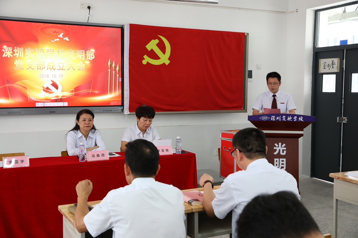 2018年10月19日上午,深圳实验学校光明部召开党支部成立大会。深圳实验学校党委委员、办公室主任冯维丹、深圳实验学校办公室副主任兼党办负责人李笑梅代表校党委参加会议。