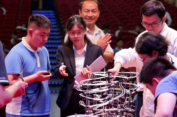 活动现场还实现了实时转播,小球是否能在同学们的巧手下,通过重重机关,顺利回到终点现场比赛呢?这让现场所有观众屏息凝神地注视着舞台和大屏幕。最后,高中部刘焱锋老师给大家讲述了实验校友张云飞的故事,鼓励大家像他一样勇于探索,勇于创新。