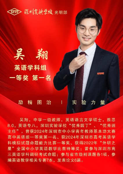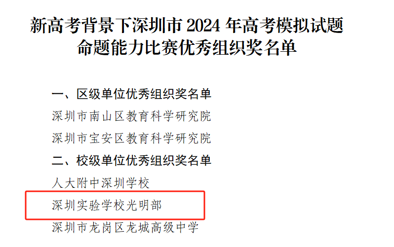 此前,在深圳市教科院于2024年4-5月面向全市各高中学校(含民办学校)举行的新高考背景下深圳市2024年高考模拟试题命题能力比赛活动中,深圳实验学校光明部凭借一等奖5人,二等奖4人,三等奖2人,以全市第二的成绩,获得优秀组织奖。