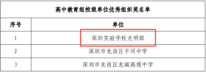 此次比赛中,深圳实验学校光明部获一等奖人数居榜首、获奖人数居榜首、总积分居榜首,获得高中教育组优秀组织奖第一名!