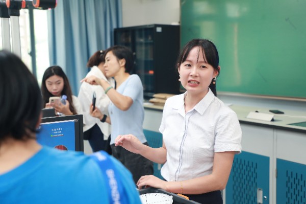 在学科主任孟惠君老师的引导介绍下,物理实验室同样给来访教师们留下了深刻印象。梁晓老师从硬件平台、教学和考核管理系统、组合创新实验仪器三个方面对物理智慧云实验室进行全面的讲解。其中实验教学信息化管理平台和实验技能考核信息化管理平台,实现了对学生实验报告的电子化和实验过程的视频记录,丰富了师生互动的内容和形式。实验台配备的模块化试验箱,可以方便学生收纳,同时为学生设计开发各类探究实验提供了强大支持。