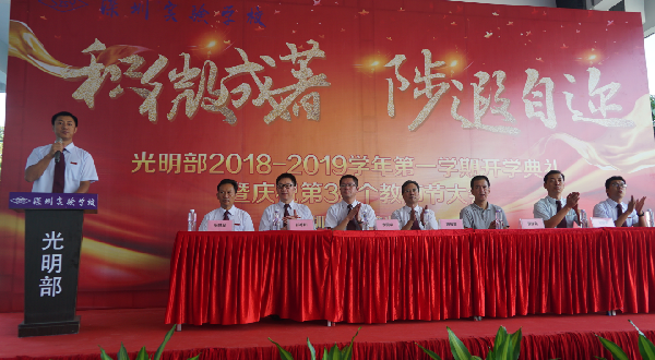 微风送爽,天朗气清,9月10日7时30分,深圳实验学校光明部首届高一新生与光明部全体教职员工齐聚一堂,在庄严的国歌声中迎来2018—2019学年第一学期开学典礼。也值此新中国第34个教师节之际,全体学生向老师们表达节日的祝福。