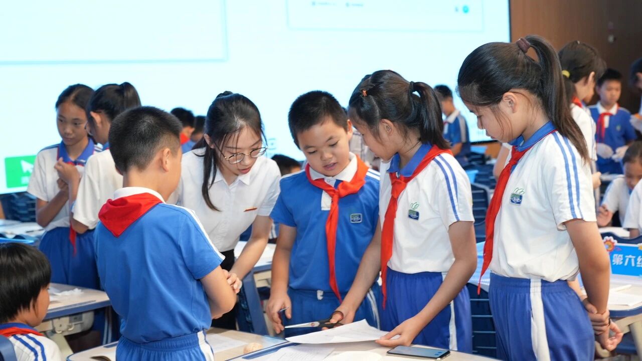 深圳实验光明学校江佳蔚老师在《橘子表面面积有多大——测量不规则图形面积》研讨课上,以陈皮制作这一生活情境抛出“用50个橘子制作陈皮,晾晒时需要多少个30cm×30cm正方形晾晒筐”的核心问题,引领学生围绕“制定测量方案—实践验证合理性—优化测量方案”的子任务链,最终生成了成果“测量橘子表面面积的初步方案和优化方案”。学生通过小组合作、动手操作,自主探索了“数方格”“贴纸覆盖”“称重”“转化成基本图形”等多样化测量方法,深度感悟了转化思想,在解决实际问题的过程中,既体会到数学与生活的紧密联系,又培养了问题解决能力与创新思维。