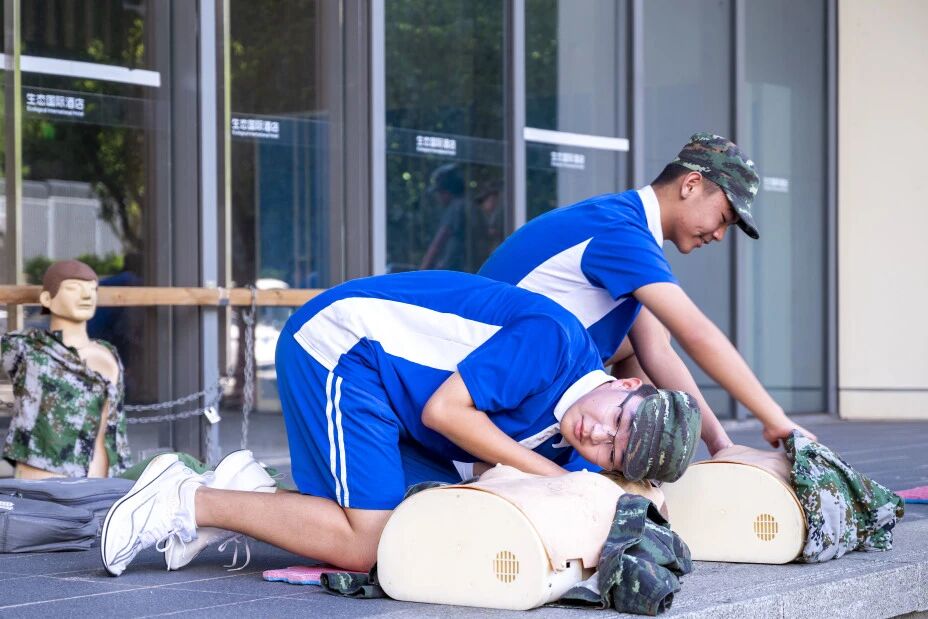 面对模拟人,教官拆解心肺复苏步骤:判断意识、胸外按压、开放气道、人工呼吸。同学们轮流上手实操,从生疏到熟练,紧盯按压位置与节奏,每一次按压都像在与“时间赛跑”,深化同学们对 “生命至上” 的敬畏。