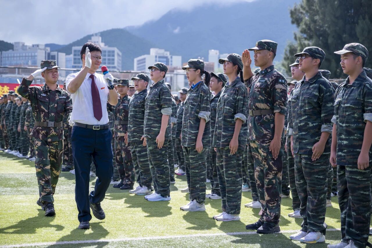 校长朱灵辉逐一检阅各连队方阵,同学们军姿挺拔、目光坚定,展现出四天训练的卓越成果。