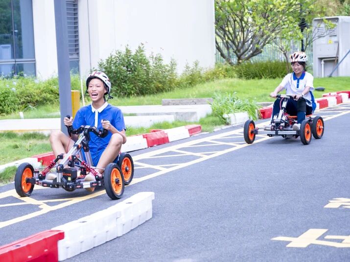 F1赛车在阳光下闪烁,轮胎压过赛道,同学们化身“赛车手”,追逐、超越、冲刺无时无刻都在上演着。