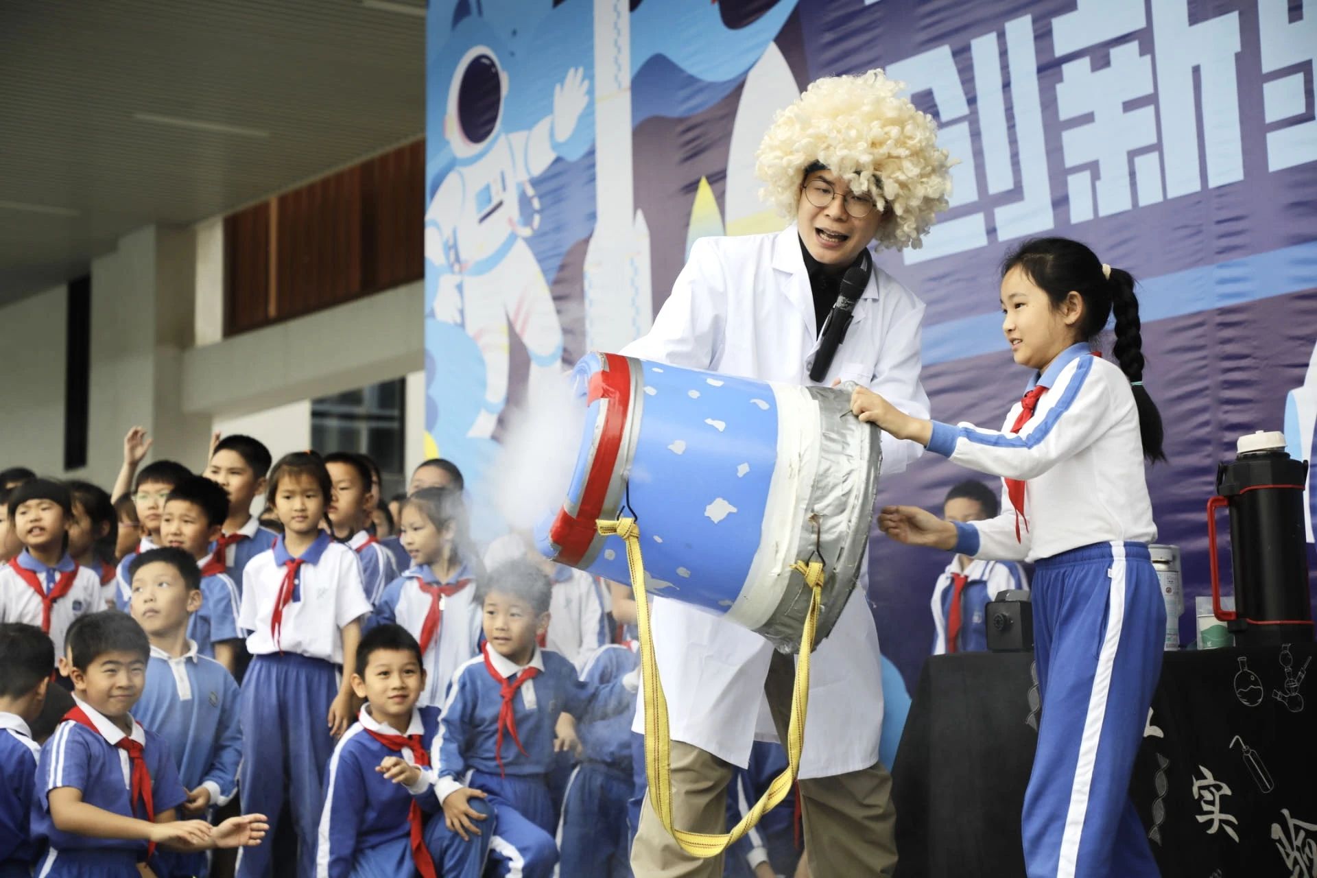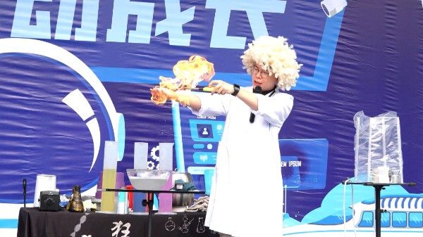 疯狂博士带来的“水火相融”、“掌中火”等精彩表演看似违背常识,却向同学们展示了科学的魅力。水与火的交织,声与色的融合,一个个奇妙的现象在舞台上呈现,让人仿佛置身于一个神奇的科技世界。同学们的阵阵欢呼将开幕式活动推向了高潮,大家纷纷报名上台参与实验,亲身体验奇妙的化学反应。