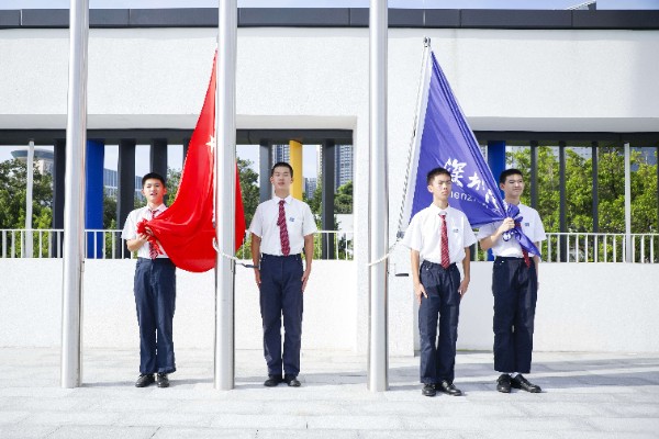 在庄严的升旗仪式中,全体师生高唱国歌和校歌。
