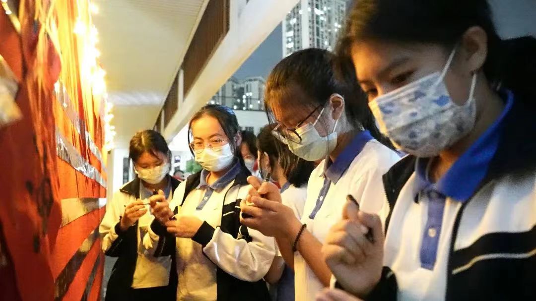 学弟学妹们提前悄悄演练,只为用荧光辉映星光,为你们加油呐喊:“韶华不负,惜时如金,敢与金鸡争晨晖;书山学海,甘之若饴,誓同梧桐共比高。”不希望你们把一次考试当作人生成败的赌注,只想让你们在年少时体会一次全力以赴。夜以继日和你们并肩战斗的老师们,为你们送上最真挚的祝福。将嘱托牢记心间,将祝福紧握指尖。阔步迈向“成功门”的你,定已装满必胜的信心和信念。