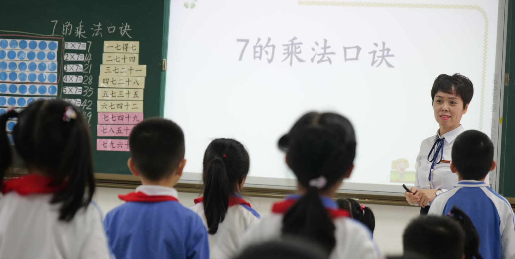 坂田部鞠双红老师为我校送上优质数学课例——二年级《7的乘法口诀》。鞠老师从手指操导入,激发学生的学习兴趣,紧接着回顾了2-6的乘法口诀,在已有的口诀探索经验上,引导学生根据点子图来写出算式,自编7的乘法口诀,并且利用线段图诠释了算法的多样性。在巩固练习环节,鞠老师通过趣味生动的“扑克牌游戏”加深学生对口诀的记忆,调动学生学习的积极性,引导孩子在愉快、宽松的氛围中背诵7的乘法口诀,学生学习效果显著。