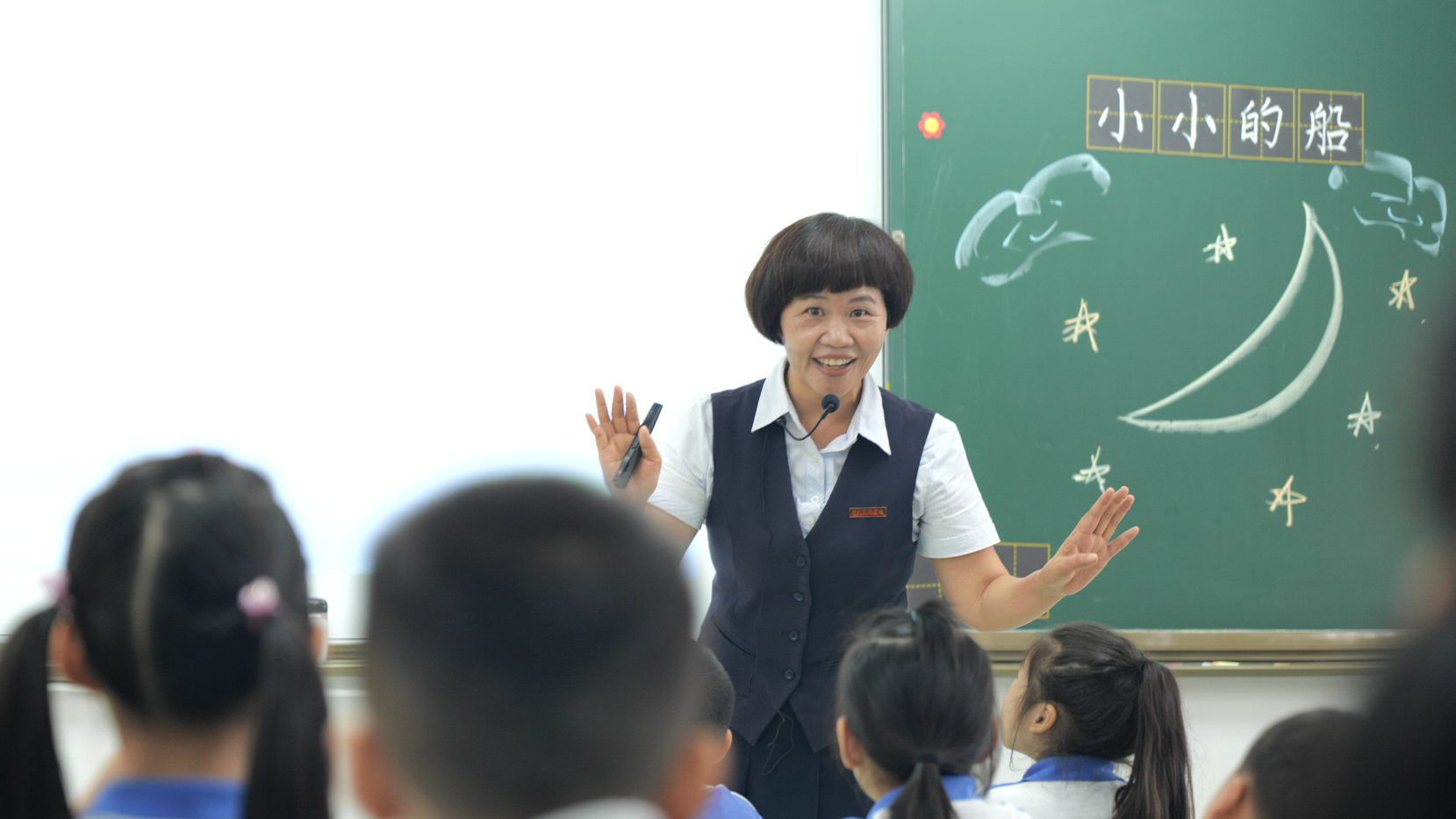 小学部袁圆老师执教一年级上册《小小的船》。课前,袁圆老师在黑板上画了两个圆圈向学生介绍自己的名字,富有亲和力的袁老师一下子拉近了与学生的距离。本节课袁老师首先以猜谜导入,让学生联想生活中的月亮,进而介绍了写这篇月亮之文的作者叶圣陶先生。紧接着,在生字学习版块,袁老师采用了拼读法、儿歌法、猜谜法等多种识字法让学生在情境中理解巩固,并引导学生关注到叠词,通过训练叠词的运用让学生将知识迁移到生活中去。袁老师执教《小小的船》,不仅带着学生入情入境,更重要的是实现了教学的一课一得,给予一年级学生够得到的学习支架,帮助他们实现学习能力的进步与“最近发展区”的跨越,如她让低段学生初步感知何为“打比方”,为高段的比喻修辞的学习打下基础。在写字环节,袁老师细心指导书写姿势、提醒生字易错点,让学生将基础知识得到进一步巩固。