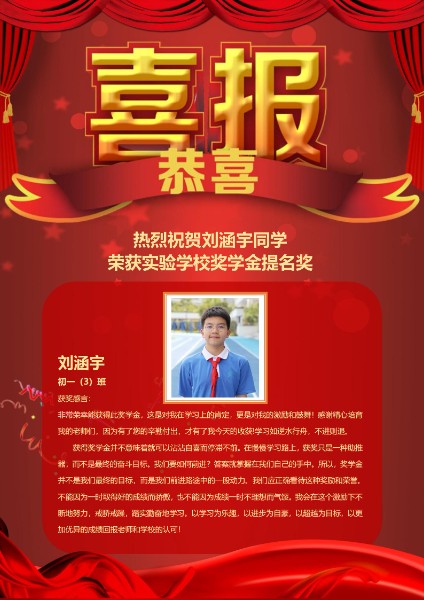 海涵地负展少年之气,气宇轩昂立鸿鹄之志。少年无惧无畏,用坚持、奋进、拼搏书写青春华章。自强不息、不甘人后,以学习为乐趣,以进步为自豪,以超越为目标,终有一天定能站在理想的顶峰笑看过往云烟。你是一个品学兼优的学生,是同学们学习的好榜样!相信心怀理想的你一定会不断超越自我,创造新的辉煌!他就是七年级(3)班刘涵宇!