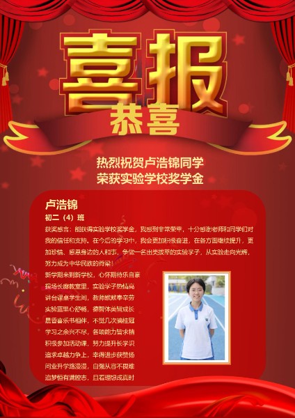朗诵节目结束后,“实验学校奖奖学金”的获奖者代表卢浩锦同学上台发言。卢浩锦同学说道,梦想一定要付诸实践才会实现,而她的梦想就是为中华之崛起而读书,为实现中国梦而奋斗。在实验文化的滋养下,她不断地进步成长,相信在励精图治的努力下,她终将实现自己的梦想。