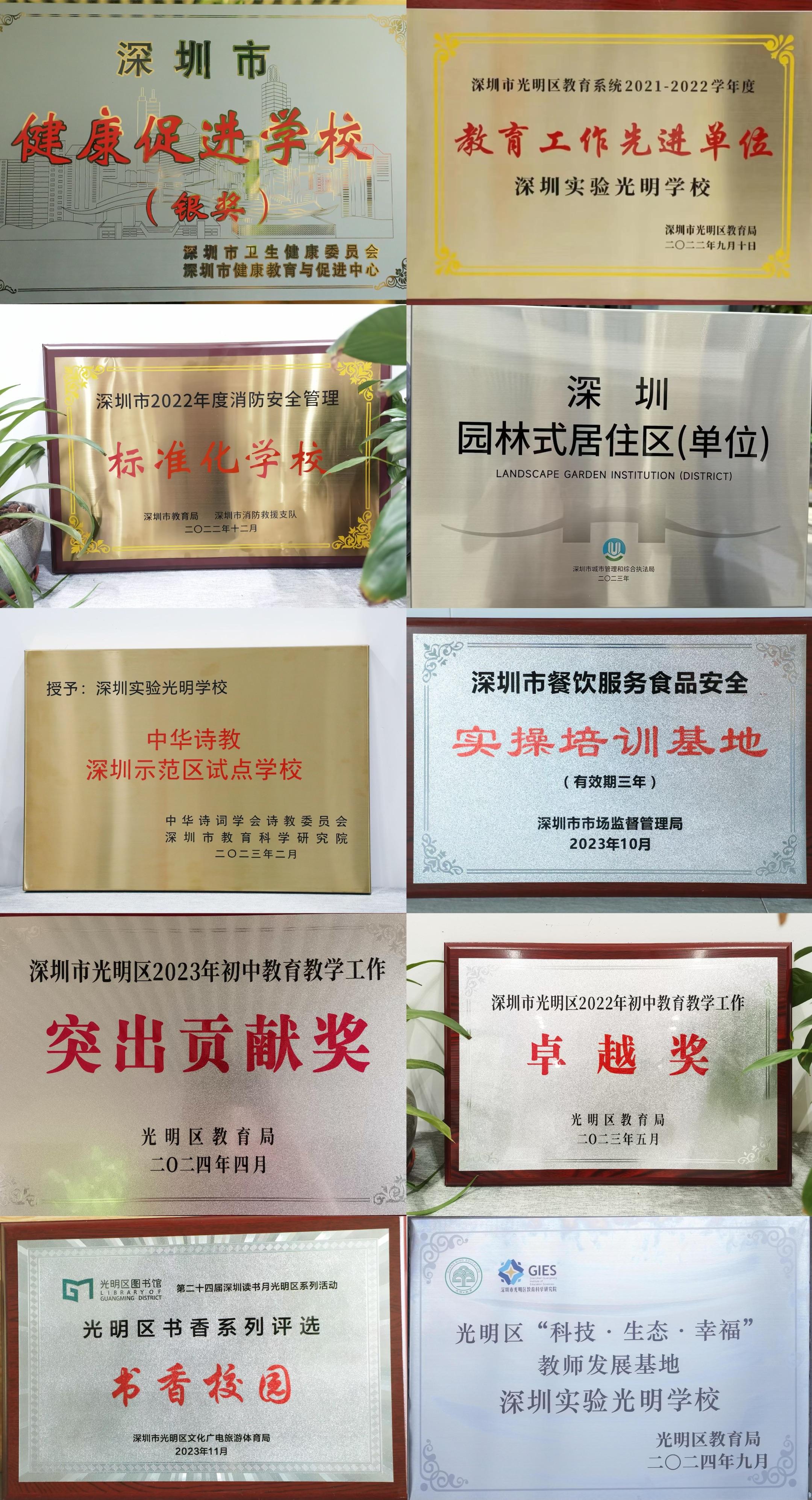 全国生态文明教育特色学校、小学低年段游戏识字教学基地学校、深圳市健康促进学校、深圳市消防安全管理标准化学校、深圳市餐饮服务食品安全实操培训基地、深圳市园林式居住区(单位)、中华诗教深圳示范区试点学校、光明区“双减”工作示范学校、深圳市光明区2022年初中教育教学工作卓越奖、光明区2023年初中教育教学工作突出贡献奖、光明区科学小记者联合培养基地、光明区“科技·生态·幸福”教师发展基地……