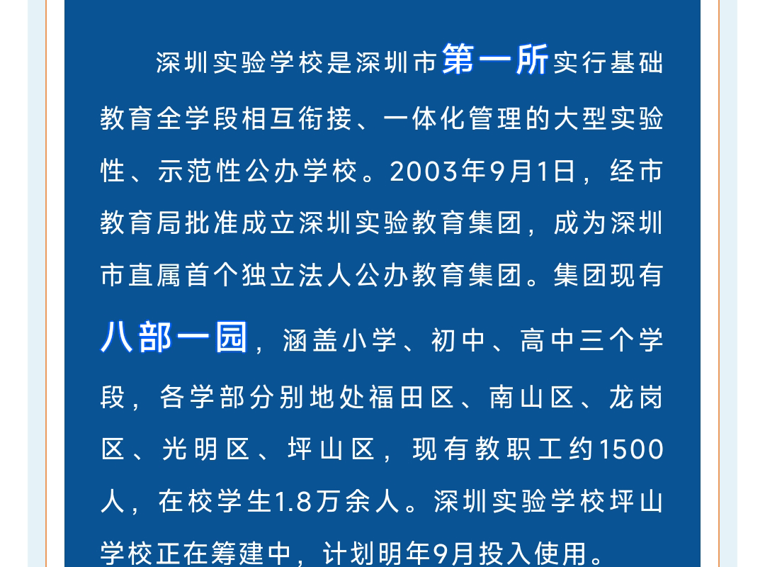 深圳实验教育集团拟于10月8日至31日赴外进行北京场、上海场、重庆场、武汉场、西安场、长沙场、南昌场、长春场、广州场、南京场、杭州场、济南场的现场宣讲。各宣讲场次时间地点待定,具体以补充公告和短信通知为准。