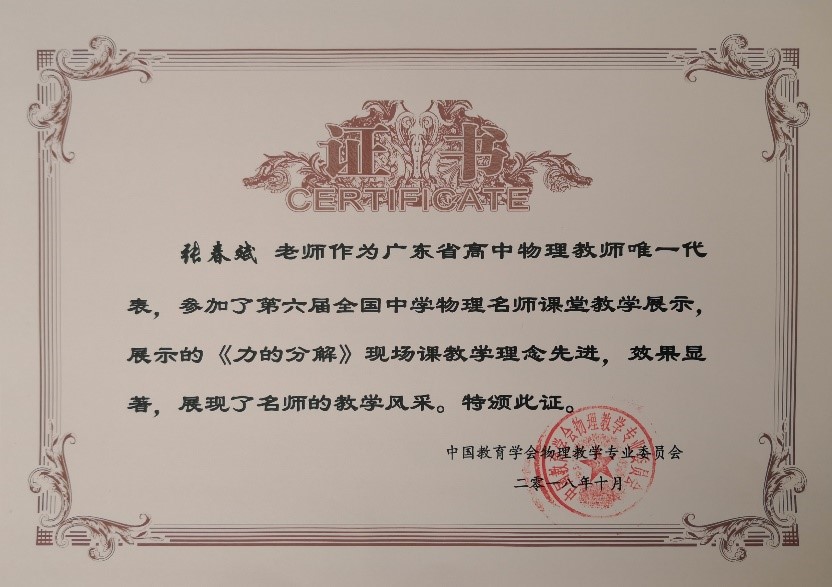 中国教育学会物理专业委员会中学物理名师课堂教学展示活动每年举办一次,参与展示活动的物理教师都是各省、自治区和直辖市通过层层选拔精挑细选出来的优秀代表。他们不仅个人教学能力突出,而且展示的课堂教学都经过了深入地研究和反复锤炼。张春斌老师代表广东省参加本届展示活动的资格并取得优异成绩,展现了名师的教学风采。