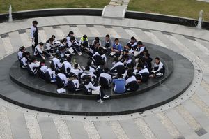 第二天下午,学生和老师团团围坐在电子大屏幕下的喷泉广场上。潺潺的喷泉水声,恰好营造了“兰亭集会”的情境氛围。一开始,由一名学生朗诵全文,接着师生一起大声背诵前两段。接下来,於老师引导学生想象当时情境,将自己当成是当时的“群贤”,每个人都要在这环形“曲水”中取“流觞”,然后“一觞一咏”,“咏”完之后决定结集出版。就在这时,王羲之“自为之序以申其志”。学生们很快进入状态。按照王羲之所描述的景致,就近取材,穿越到当时情境之中。体验着体验着,问题来了:作者为什么写景写得如此简洁?作者为什么要说“信可乐也”(确实值得喜悦啊)?难道这“乐”中有什么问题吗?为什么接下来作者说“人之相与,俯仰一世”?为什么举出这样两类人:“或取诸怀抱,悟言一室之内;或因寄所托,放浪形骸之外”?又为何在这美丽的自然人文坏境下由“乐”转为“痛”而又“悲”?……对于这些问题,学生们踊跃发言,教师适时点拨。一堂课很快在热烈的讨论声中结束了。