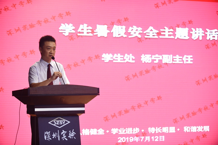 最后,学生处杨宁副主任就暑假学生安全做了《暑假生活建议与身心安全指导》专题讲话。他从事例出发,对全体学生暑假生活给予指导和建议,建议学生合理规划、劳逸结合,特别强调了安全的重要性,预防溺水、网络安全、交通安全、居家安全、用火用电安全、雷雨天气安全、饮食安全等方面,要时刻铭记于心,不能放松!