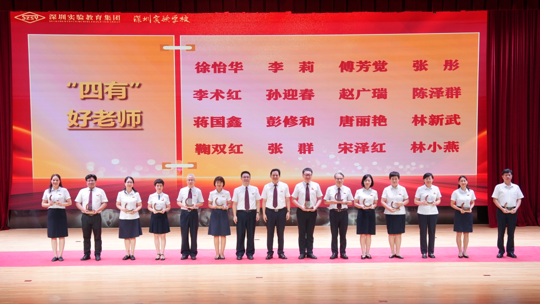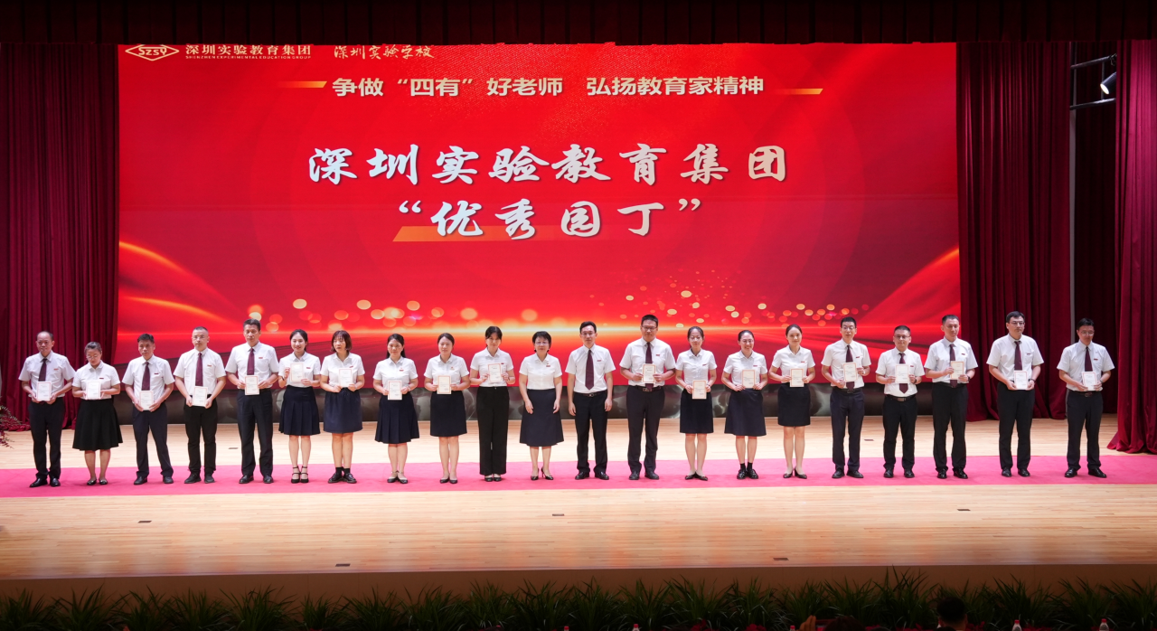 刘焱锋、刘晓利、王特、陈兆华、马春雨、丁伟、郑雪枫、王建周、蔡馥玲等419名老师被评为深圳实验教育集团“优秀园丁”,涂瑞倩、冯丰、王志强、秦哲、王凯、王燕、甘玉兰等91位教师被评为深圳实验教育集团“优秀班主任”,李笑梅副校长、张楠副校长、潘浩执行校长、王洪吉执行校长为他们颁奖。