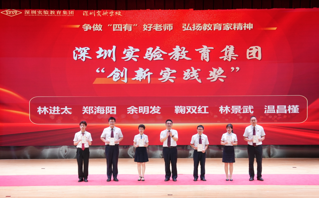 高中部林进太、光明部郑海阳、初中部余明发、坂田部鞠双红、小学部林景武、光明学校温昌槿被评为深圳实验教育集团“创新实践奖”,邓旭副校长为他们颁奖。