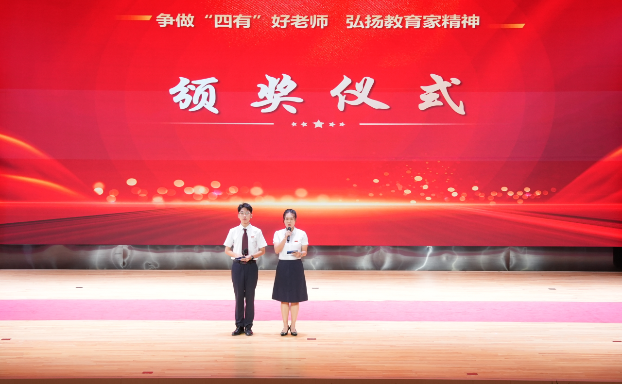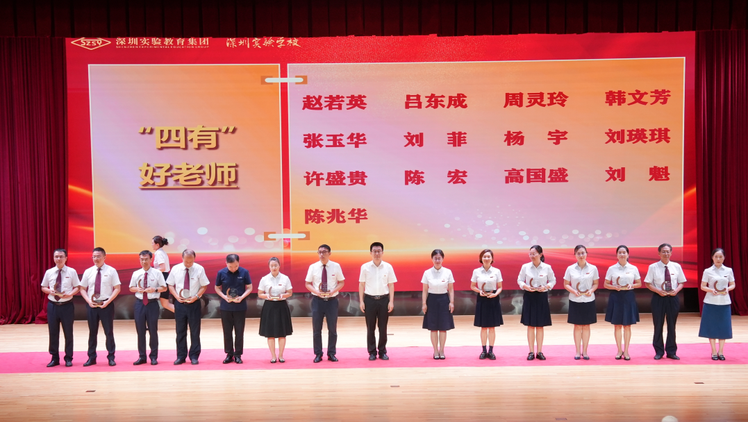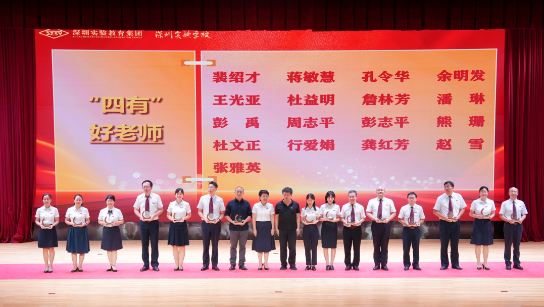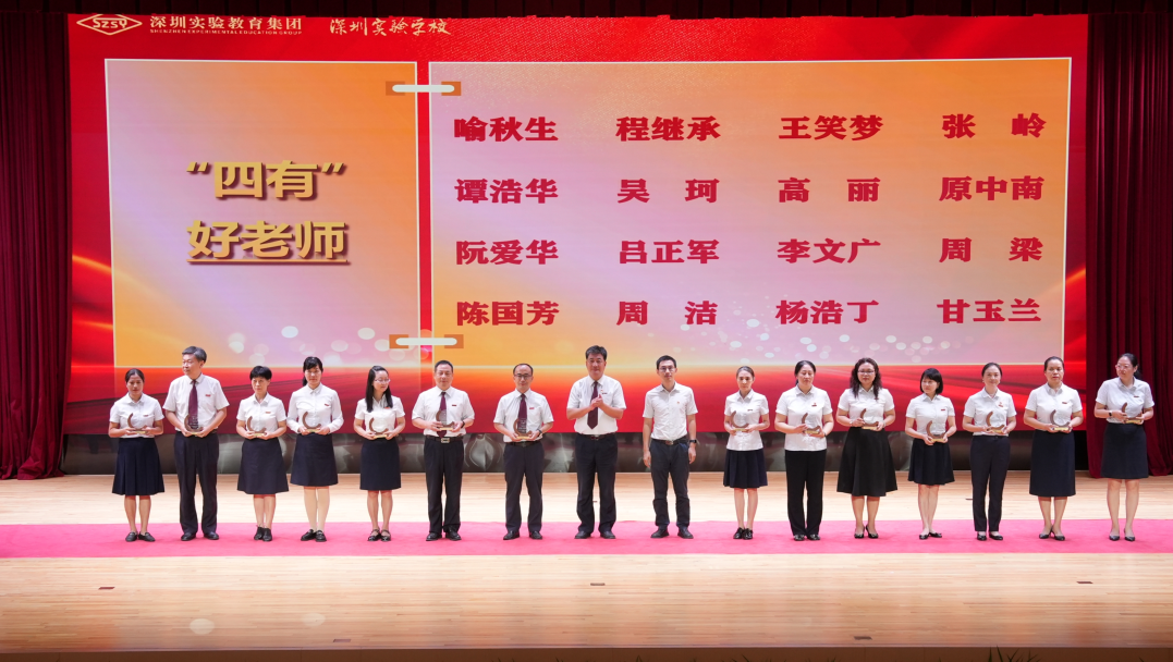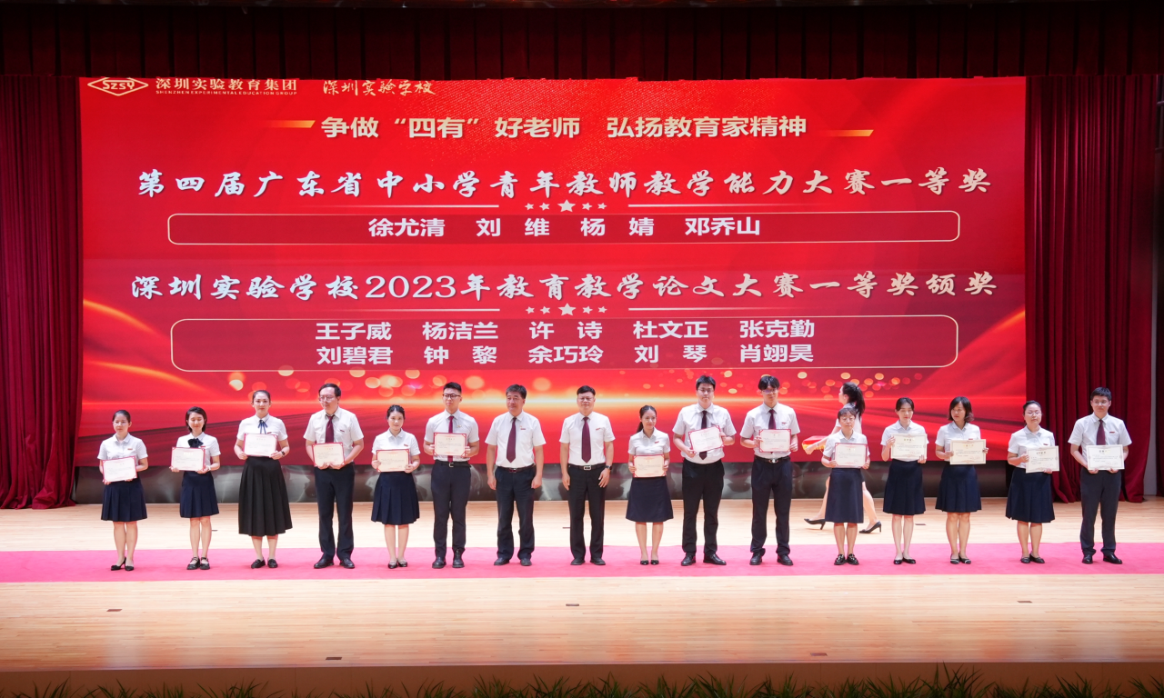 校纪委书记、副校长王喜峰宣读了《深圳实验教育集团2023—2024学年度表彰决定》,62位“四有”好老师、获得第四届广东省中小学青年教师教学能力大赛一等奖的4位老师和深圳实验学校2023年教育教学论文大赛一等奖的10位老师,以及获评本学年度优秀园丁、优秀班主任、优秀团队、创新实践奖、突出贡献奖的教师或教师代表先后上台领奖,展示出实验教师敬业、创新、严谨、精深的优秀品质。