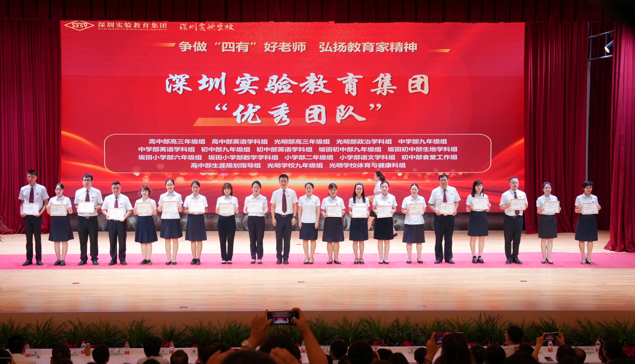 高中部高三年级组、英语学科组、生涯规划指导组,光明部高三年级组、政治学科组,中学部九年级组、英语学科组,初中部九年级组、英语学科组、食堂工作组,坂田初中部九年级组、生地学科组,坂田小学部六年级组、数学学科组,小学部二年级组、语文学科组,光明学校九年级组、体育与健康科组被评为深圳实验教育集团“优秀团队”,邓娟副校长、杨宁副部主任为他们颁奖。