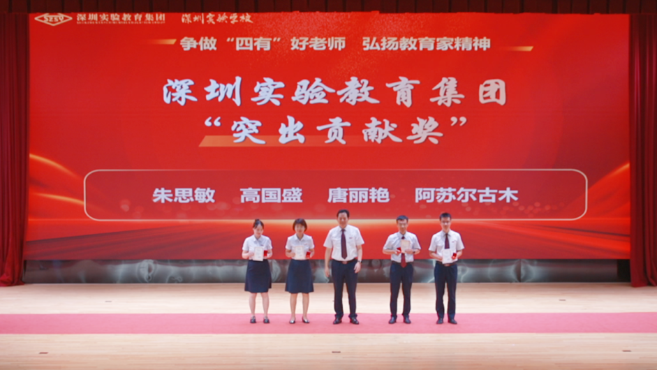 高中部朱思敏、光明部高国盛、中学部唐丽艳、光明学校阿苏尔古木被评为深圳实验教育集团“突出贡献奖”,夏育华书记为他们颁奖。