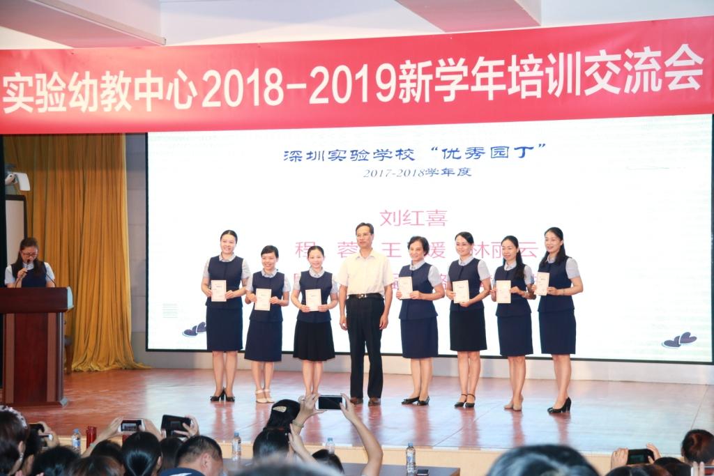 上午8:30分,交流会准时开始。首先进行的是深圳实验学校2017—2018学年“优秀园丁”的颁奖典礼!在激动人心的音乐声中,实验学校衷敬高校长和集团办公室冯维丹主任,以及幼教中心的刘红喜主任分别为获得“优秀园丁”的园长、教师及后勤人员颁发了获奖证书。