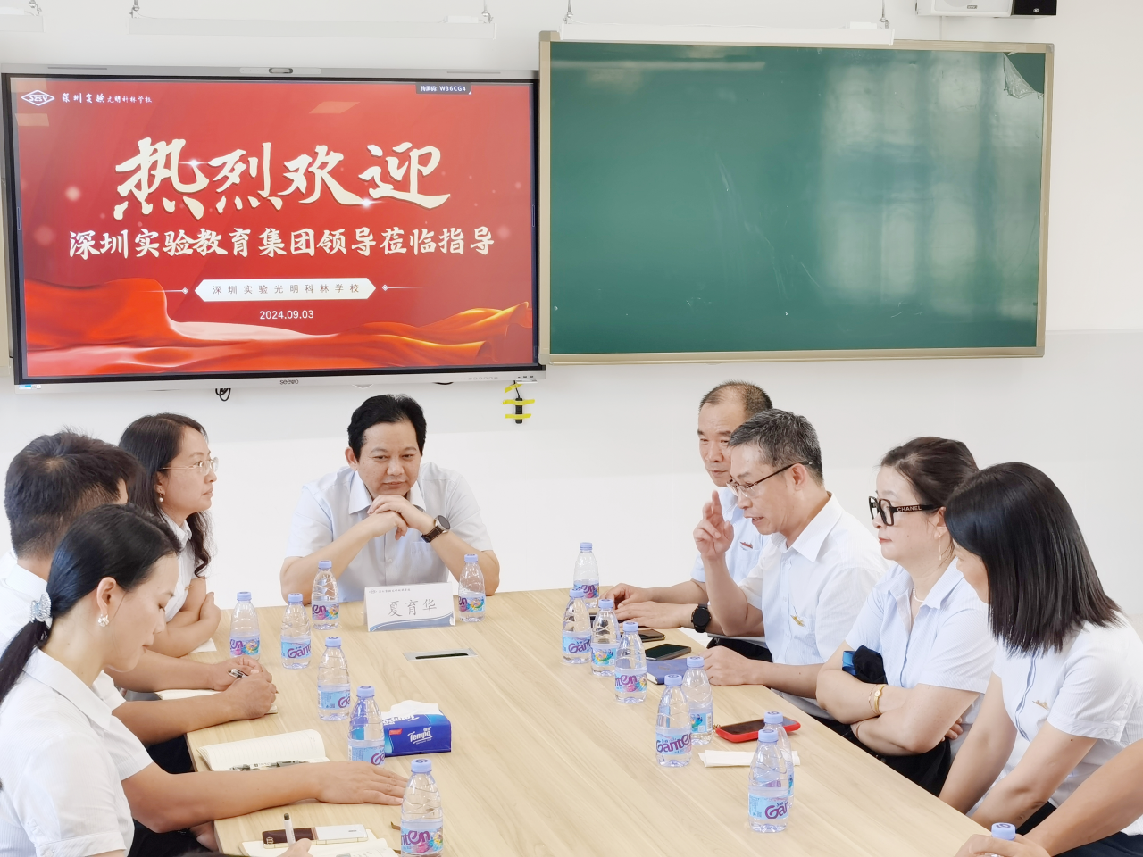 光明科林学校借址在光明区外国语学校办学,夏书记一行与光明科林学校校长王洪吉及行政团队座谈交流。