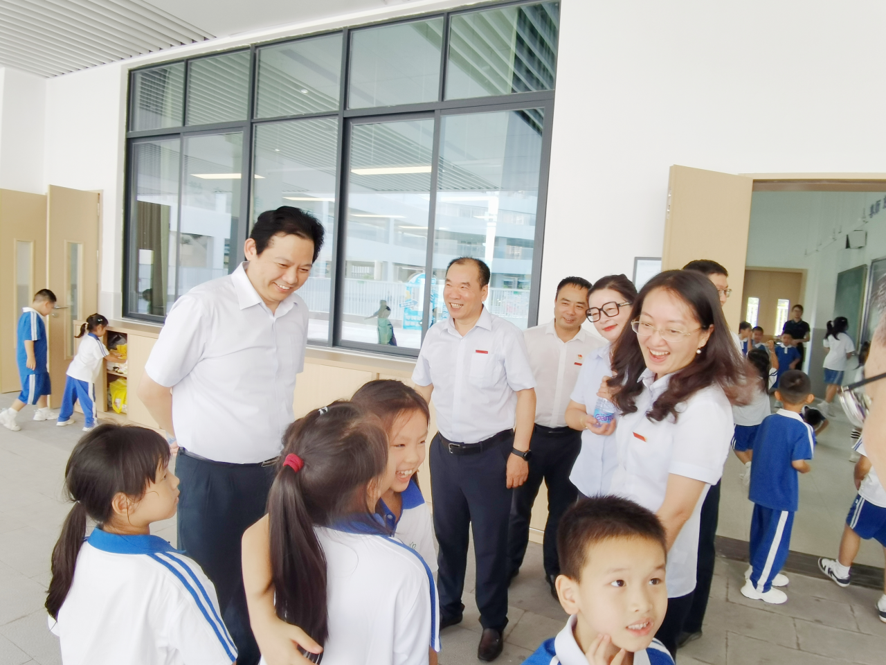 在小学部,副校长兼小学部执行校长吴立新陪同调研,夏书记一行与正在操场拍照的孩子们合影留念。