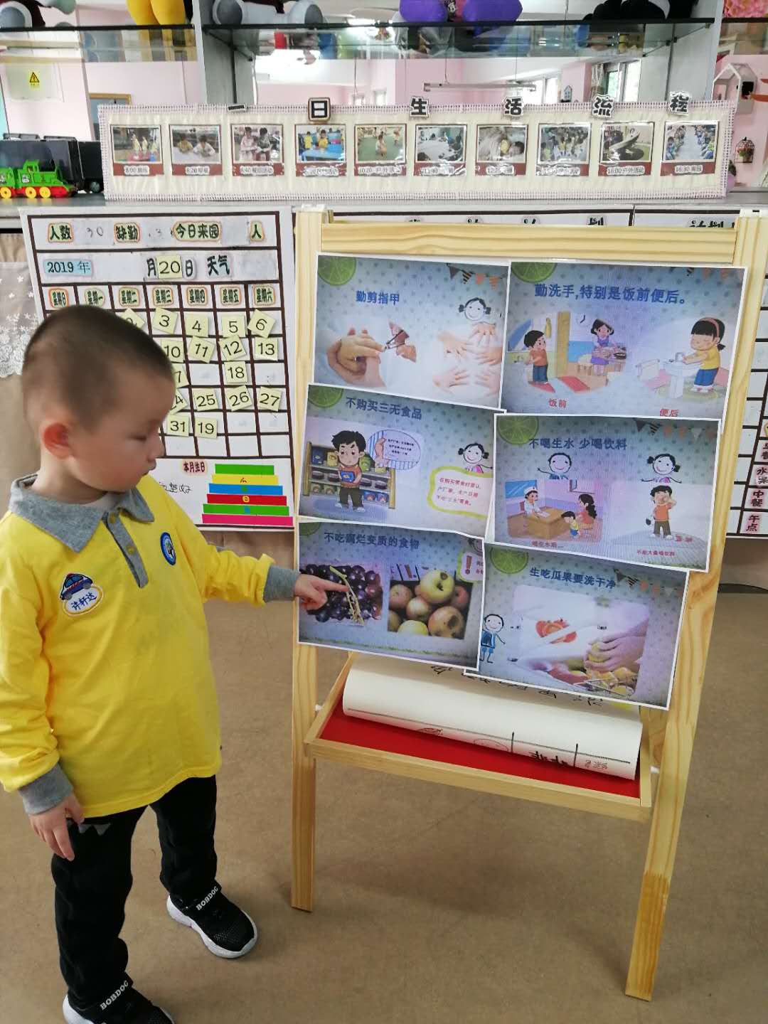 在日常活动中,各班级利用晨谈或餐前等环节,通过视频、实例等组织大家学习“食品卫生安全”的知识,教育幼儿养成讲卫生的好习惯,学会识别食品包装的日期,了解不同食物的吃法,不吃腐败变质的食物等。