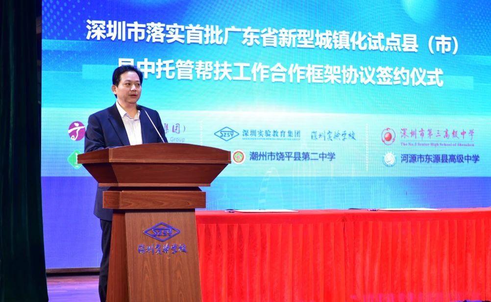 此前,2025年1月23日,深圳市教育局在深圳实验学校举行了深圳市落实首批广东省新型城镇化试点县(市)县中托管帮扶工作合作框架协议签约仪式,深圳市委教育工委副书记、市教育局党组成员王汝津代表深圳与肇庆、潮州、河源三地签约。