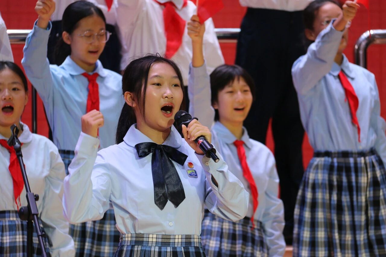 李笑梅执行校长携党员教师、共青团员以及少先队员代表,上台倾情献唱,演绎承前启后、矢志不渝的青春担当与家国情怀。用“党建带团建队建”的方式体现“传帮带”的精神力量,党旗所指,团旗所向,队旗飞扬,薪火相传续写华章!歌曲结尾,全体师生齐声高呼 “祖国放心,强国有我”铮铮誓言尽显实验人的使命担当!初一(12)班、(9)班、(2)班先后为国庆献唱,台下师生受其感染,高声和唱,“爱国情、强国志、报国行” 的种子深耕心底。
