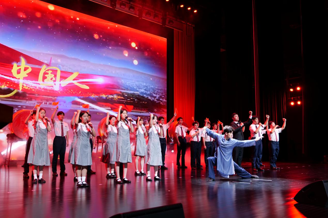 余音袅袅,情意绵长。学生代表袁乐萌、郑泸杰、詹镇菡、张朝阳、姚思晨、张咏涵相继登台,倾情献唱经典之作《我爱你,中国》。歌声嘹亮,情真意切。台下师生挥动手中国旗,如赤浪翻涌,似心火燃烧,汇成一片跃动的红色海洋。