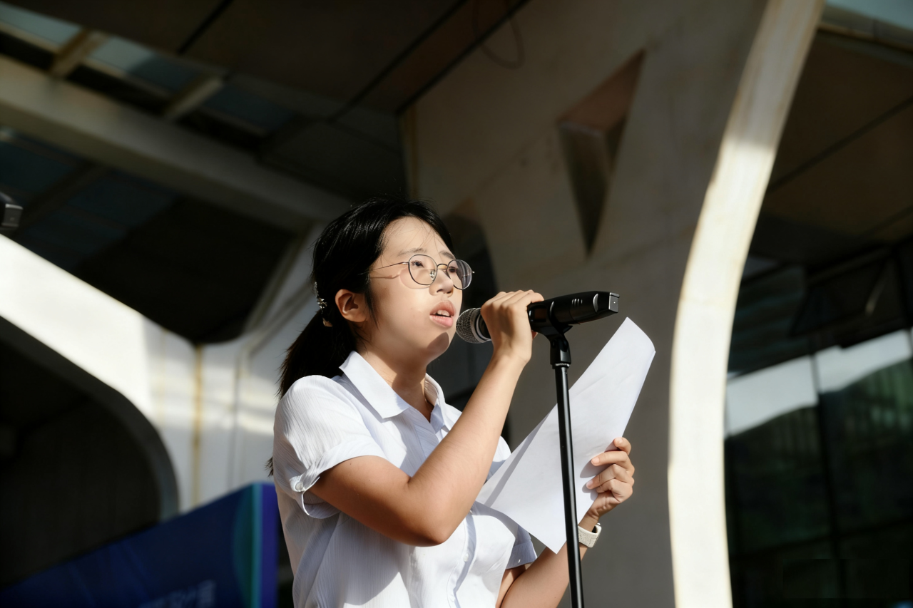 升旗礼毕,由苏岩老师执笔创作的原创诗篇《四秩校史承薪火,七六国诞焕荣光》在田径场上深情回响。黄吴悠、柯俊老师携高一12班黄泽馨、高一16班丘子洋同学共同朗诵,以声传情,以诗明志。诗句如泉涌,情感似潮生。朗诵者声情并茂,听者心驰神往,将全场氛围推向情感的高峰。