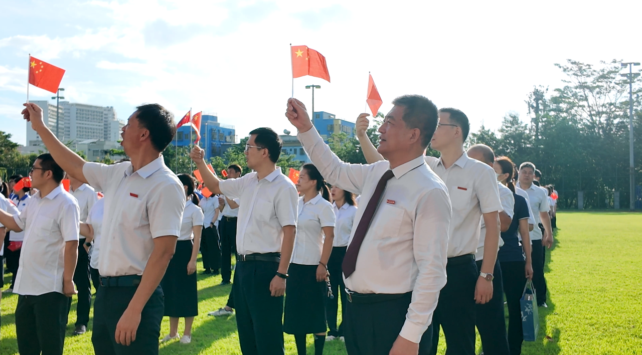 晨会最后,全场挥舞五星红旗,齐声高唱《歌唱祖国》,节日氛围达到顶点!