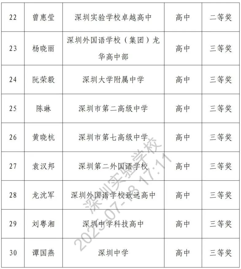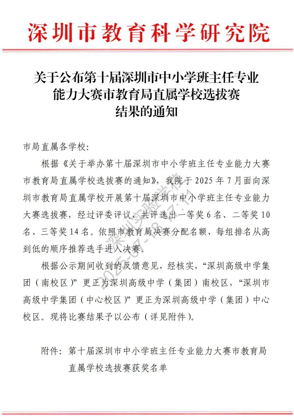 近日,市教科院公示了第十届深圳市中小学班主任专业能力大赛市教育局直属学校选拔赛评审结果,我校陈祺、杨静老师荣获一等奖,李仪恒、张然、方斯婷、曾惠莹老师荣获二等奖,单文、闫月静老师荣获三等奖。获奖人数占获奖总数的26.7%,一等奖获奖人数占一等奖总数的33.3%,两项排名均位列第一。