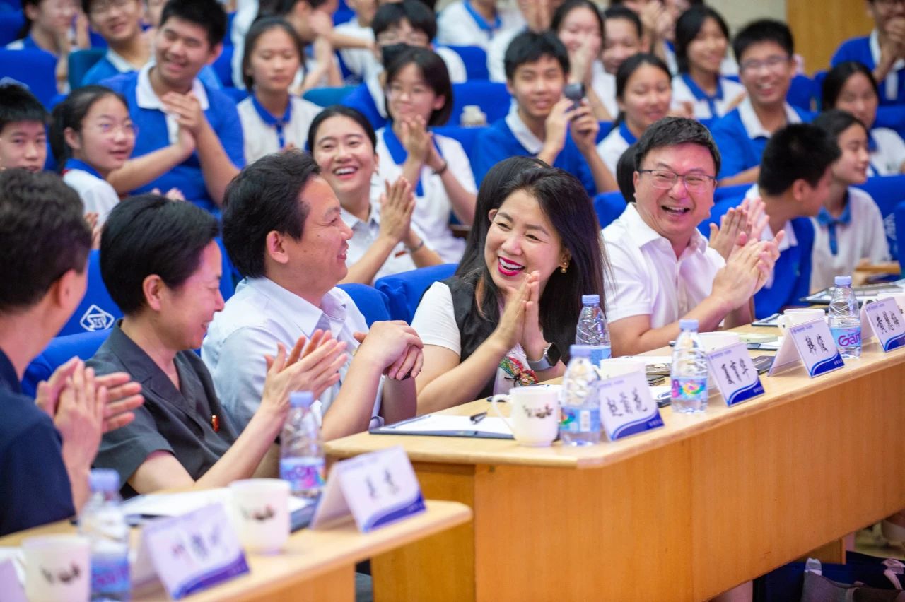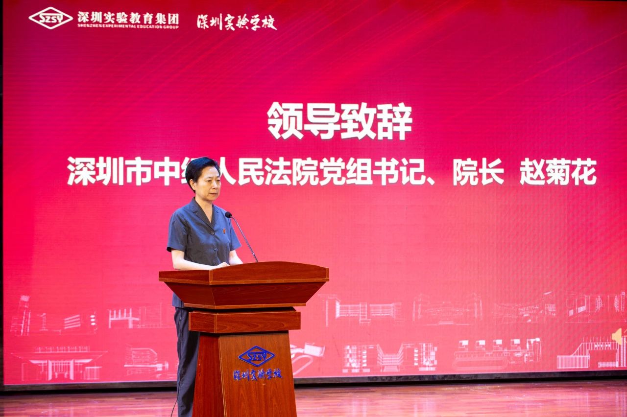 深圳市中级人民法院党组书记、院长、深圳实验学校法治副校长赵菊花,深圳市教育局党组成员、二级巡视员关苏,广东省人大代表韩俊、黄慧梅,深圳市人大代表朱文豪,深圳市政协委员王雪、孙莉莉等领导嘉宾亲临现场。深圳实验学校党委书记夏育华携副校长余志勇、邓娟等校领导出席活动,我校中学部初一、初二年级师生代表在现场参加,其余师生在教室观看同步直播,反响热烈。