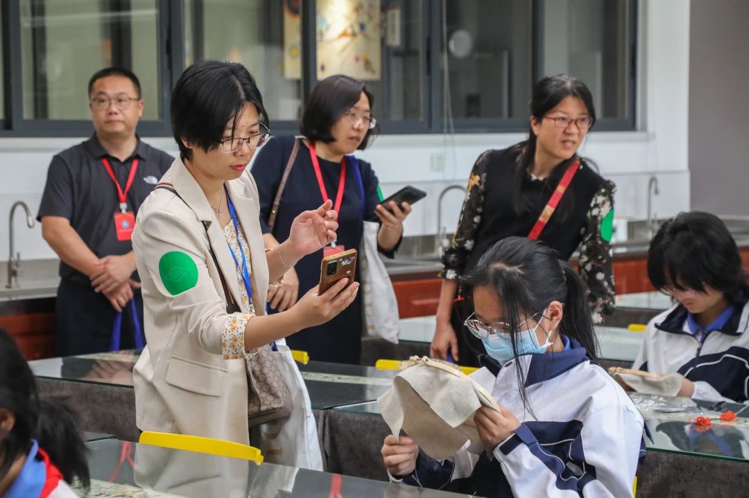 在初中观摩环节,嘉宾参观了坂田部初中第八届艺术节美育作品展,刺绣、水彩画、麦秆画、书法及陶艺等作品,深入小蜗牛戏剧社、星耀舞蹈团等6个美育社团课堂,了解坂田部以中华优秀传统文化为基底的特色课程实践。