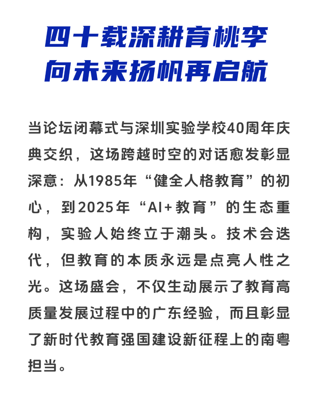 2025年4月17日下午,由广东省教育厅指导的基础教育督导与评价创新分论坛在深圳实验学校初中部圆满举行。论坛聚焦教育督导评价体系现代化,汇聚教育督导专家、名校(园)长及AI教育领军人物,共探教育强国建设路径。