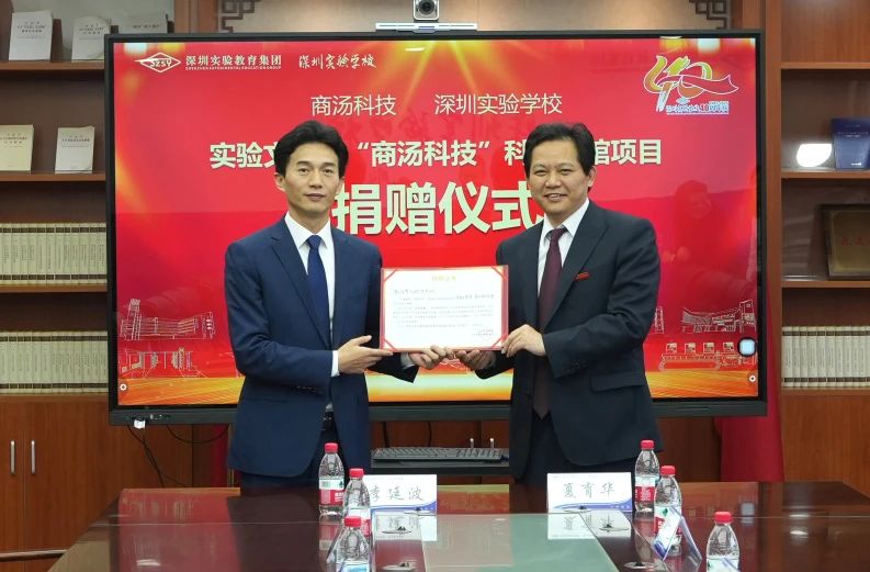 4月11日上午,深圳实验学校与深圳市商汤科技有限公司(以下简称“商汤科技”)举行捐赠仪式,双方就共建“深圳实验学校文博馆 · 商汤科技科普专馆”达成协议。深圳实验学校党委书记夏育华向深圳商汤科技总经理李廷波颁发了捐赠证书,深圳实验学校副校长余志勇、吴立新和集团总部相关工作人员共同见证。