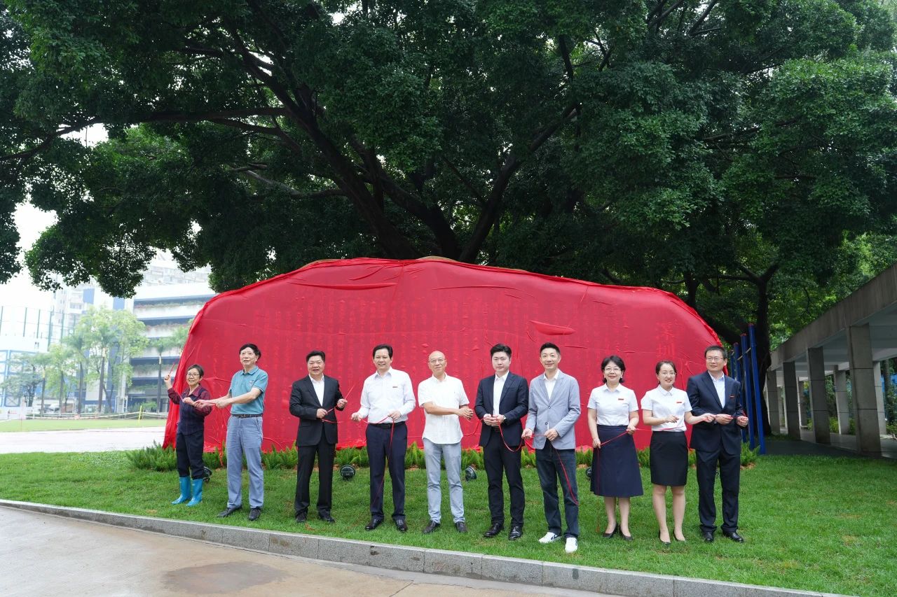 上午10时整,夏育华书记与黄华坤先生,原副校长冯维悌与邱英萍,副校长余志勇、李笑梅、邓娟,校友代表马国宾、阮斌和黄元正共同执起红绸。随着绸布滑落,文化石巍然显现。这块镌刻着《实验赋》的文化石,见证着四十年筚路蓝缕的辉煌历程,凝聚着校友与社会各界的深情厚谊,更承载着实验人的精神血脉。
