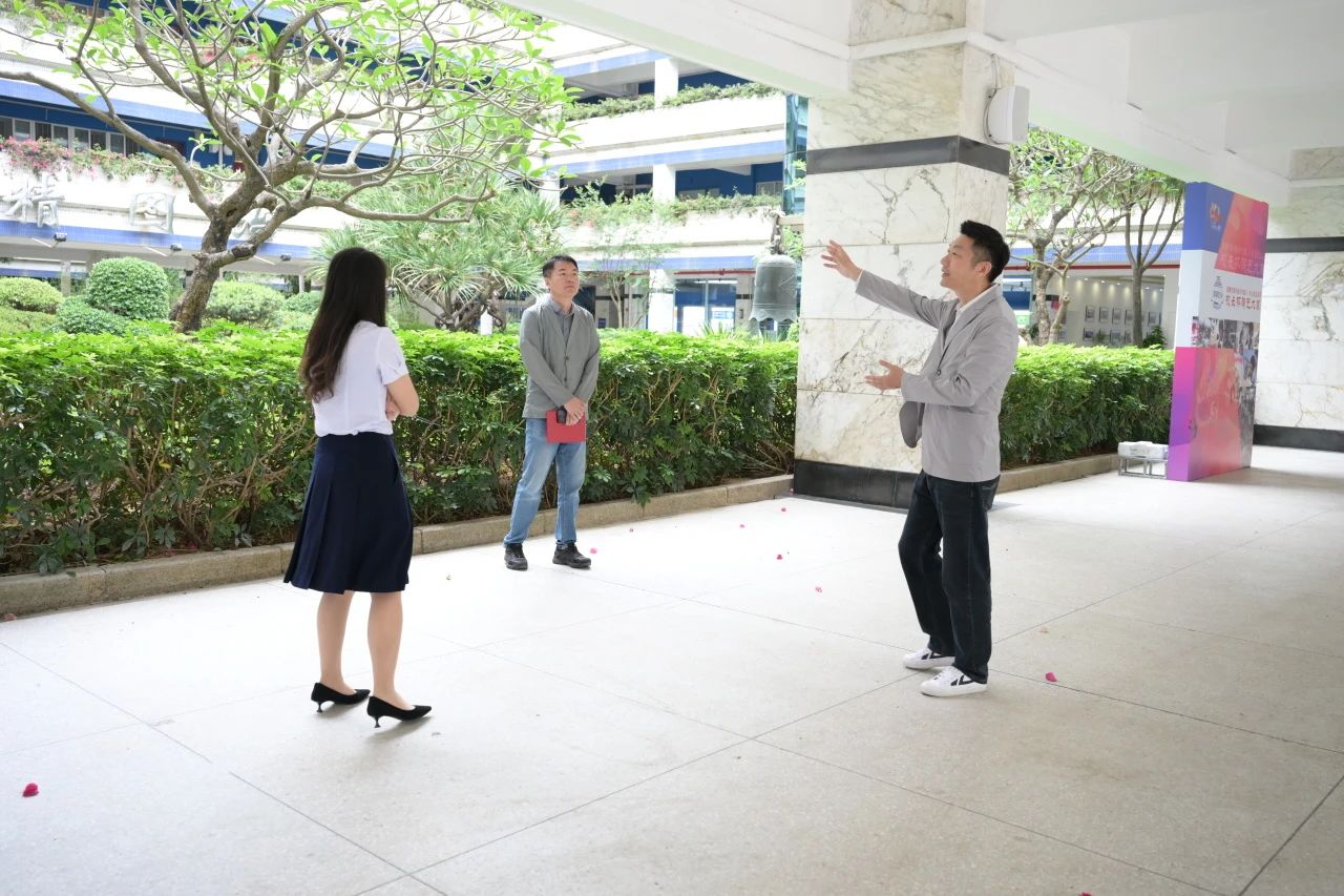 仪式结束后,在学校副校长兼中学部执行校长邓娟、集团校庆办主任靳军强一行陪同下,马国宾校友和马越鹏校友实地考察了“次元体”科幻艺术装置的安放位置,并就现场细节展开沟通。(文/吴晓 图/靳军强)