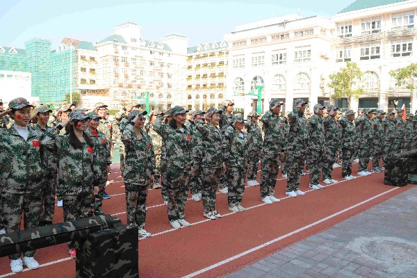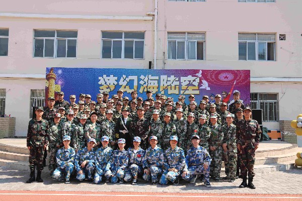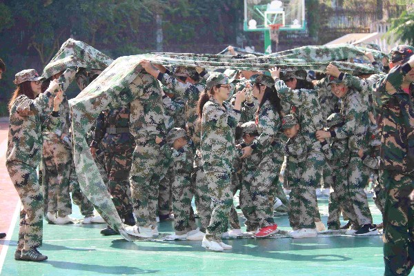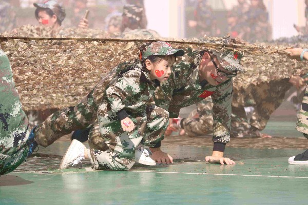 在教官军体拳和三军的律动展示后,紧张的军事训练开始了,匍匐前进、水上冲浪、翻越丛林、铁甲战车、救护伤员……一个个的激烈项目让大家学会了自强自立、坚持到底。军事训练结束后,三军战队席地而坐,开始了拉歌活动,《团结就是力量》《1234歌》《打靶归来》,响亮的歌声中洋溢着中国人的自豪。最后在女兵们英姿飒爽的舞姿中,我们的军事演习活动圆满结束。